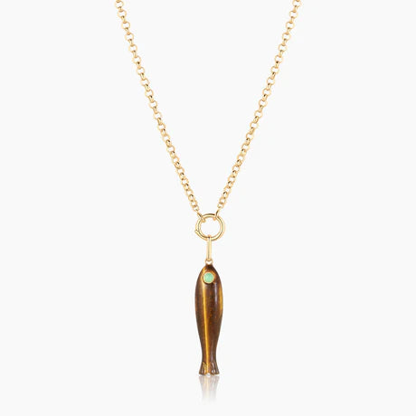 She's a best seller for a reason. Our new favorite hand-carved gemstone fish charm has quickly become the must-have charm of the season. This tiger's eye fish (with a chrysoprase eye!) Comes layered with your other favorite pearl charm. Our Fortuna isn't just a cute charm, it's a little amulet for good fortune and luck.