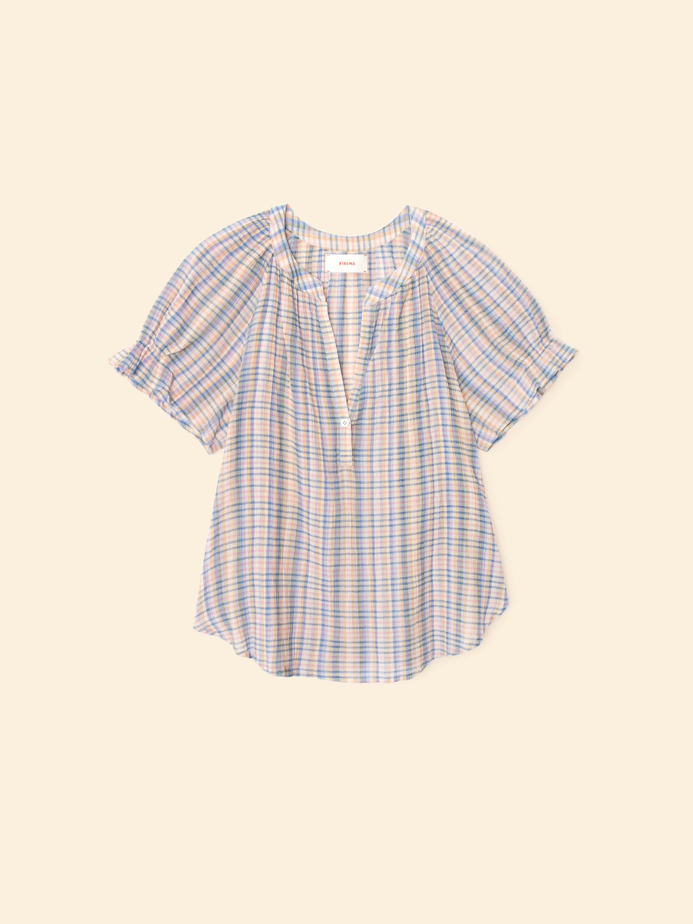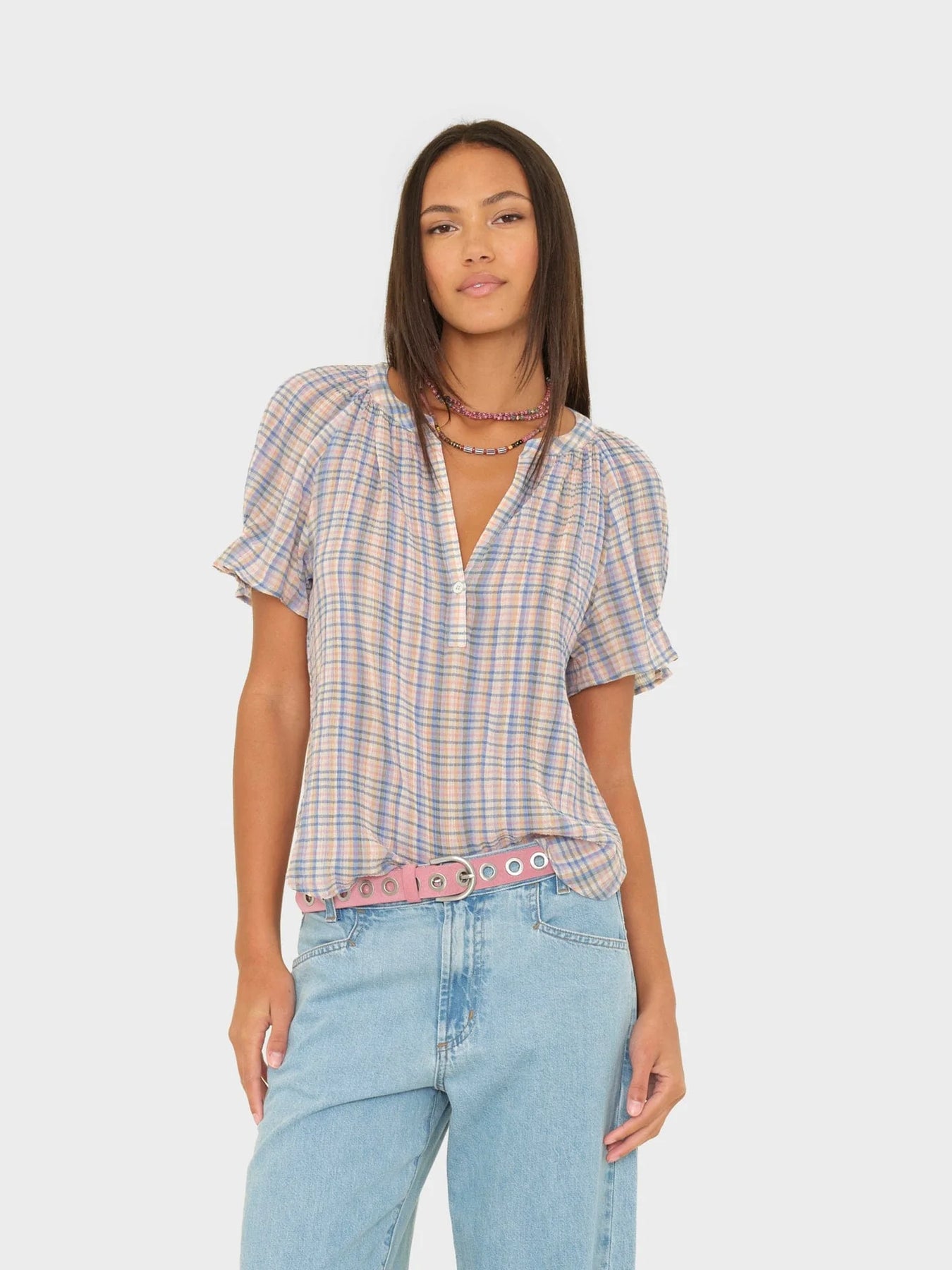 Pretty in Print. Astryde is updated this season in our cotton confetti check print. Astryde is a femme V-neck blouse that features a singular button-closure, short puff raglan sleeves with elastic ruffles, and shirred details throughout.