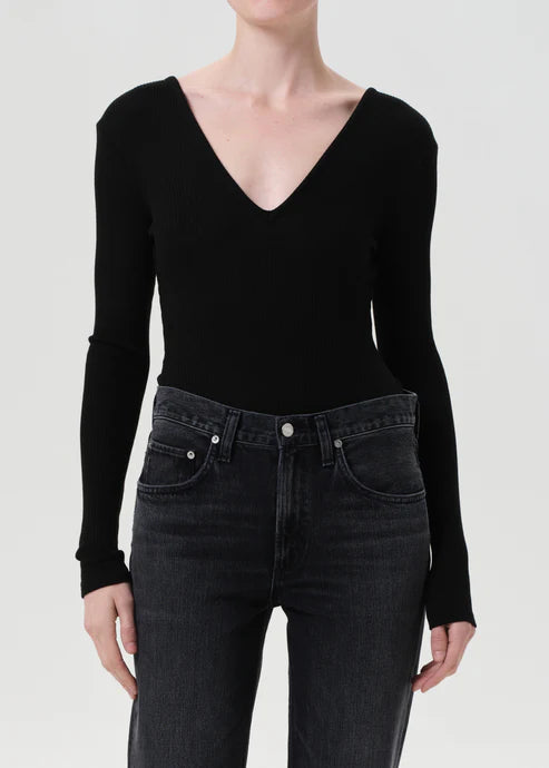 The Darla Bodysuit is a sleek, deep V-neck silhouette crafted in a super soft sweater rib with the perfect amount of stretch. Designed to hug the body in all the right places, the true black hue makes it an effortless base layer. Style with relaxed denim or under tailoring for a clean, modern look.