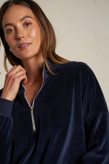 why we love it: we love the kiva because it takes a fan-favorite shape and makes it feel fresh for the season. the velour fabrication adds a touch of polish, while the dropped shoulder and zip neckline bring a relaxed yet refined vibe. pair it with the alex pant for a full set, or wear it with denim for an elevated casual look.