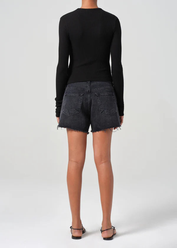 The Parker Long shorts are crafted from non-stretch, regenerative cotton in a saturated black denim wash, complete with subtle whiskering for a lived-in look. With a relaxed high-rise and ample room in the thighs, these shorts offer both comfort and effortless style. Pair them with a simple tee for a laid-back vibe, or elevate with a tailored top for a more refined look.
