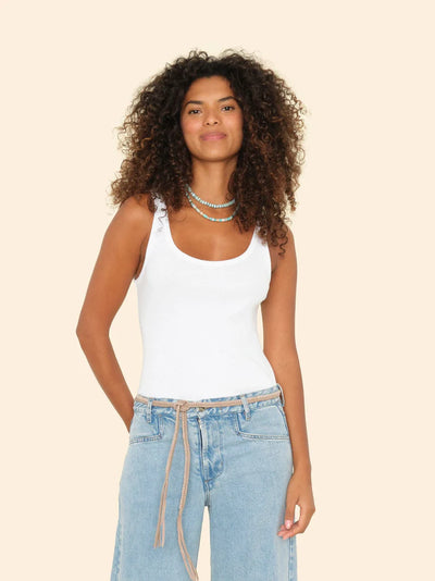 Back to Basics. Beck is new this season in our fine cotton rib knit. This soft tank has a deep scoop neck, double binding straps, and a straight hem.
