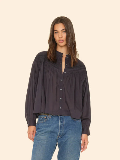 Picture Perfect. Clara is new this season in our superfine cotton voile with a soft hand. Clara is a smocked button-front blouse with a ruffle collar, pintucks, shirred front V-yoke, drop shoulders with delicate blouson sleeves, and shirred back yoke.